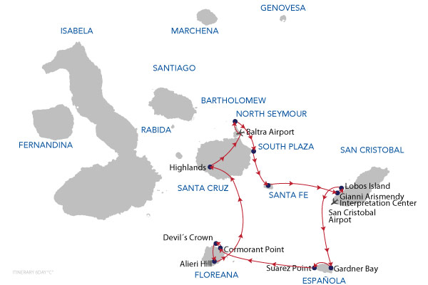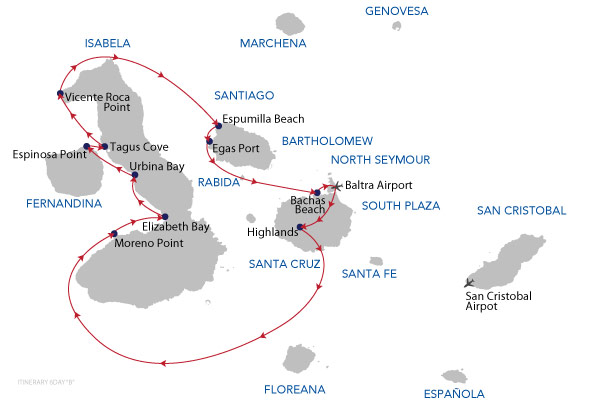 Keep in mind: it is very unlikely that itineraries will vary from those published, however they are subject to change. Climate, wildlife, instructions from the Galapagos National Park, the specific abilities and interests of passengers, as well as operational issues may cause your guide or captain to change the time or type of visits. Your guide will always strive to select the best itinerary within those limits.