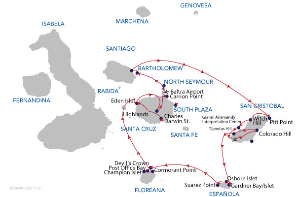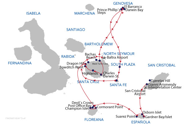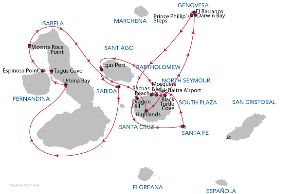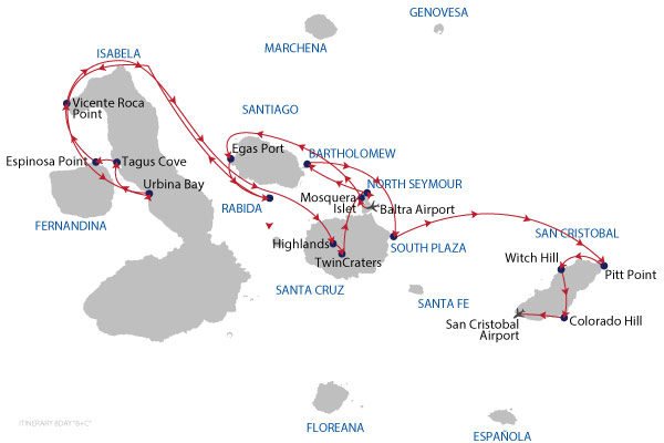 Keep in mind: it is very unlikely that itineraries will vary from those published, however they are subject to change. Climate, wildlife, instructions from the Galapagos National Park, the specific abilities and interests of passengers, as well as operational issues may cause your guide or captain to change the time or type of visits. Your guide will always strive to select the best itinerary within those limits.