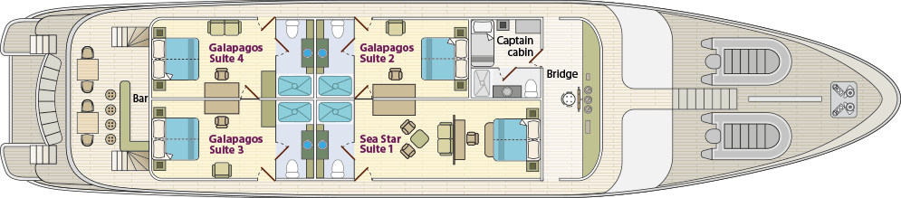 This yacht combines luxury, privacy and comfort in the marvelous setting of the Galapagos Islands. Galapagos Sea Star has a capacity for 16 passengers, it features 7 spacious Galapagos & Balcony suites and 1 Sea Star Suite) equipped with panoramic windows to enjoy the wonderful landscapes of the islands, private bathroom, hot/cold water, air-conditioning. There are twin beds or one queen bed connected suites for families.