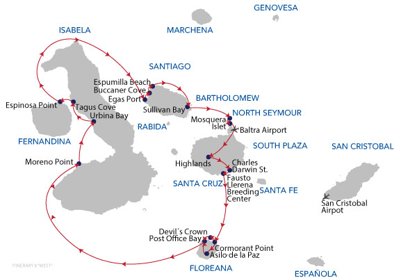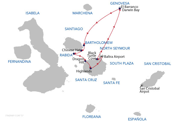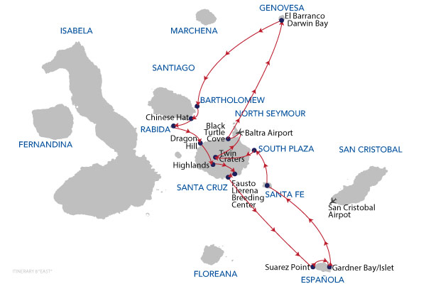Keep in mind: it is very unlikely that itineraries will vary from those published, however they are subject to change. Climate, wildlife, instructions from the Galapagos National Park, the specific abilities and interests of passengers, as well as operational issues may cause your guide or captain to change the time or type of visits. Your guide will always strive to select the best itinerary within those limits.