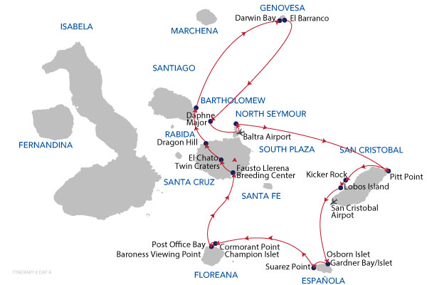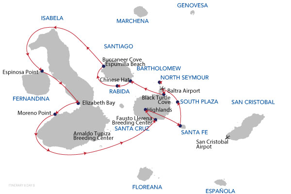 Keep in mind: it is very unlikely that itineraries will vary from those published, however they are subject to change. Climate, wildlife, instructions from the Galapagos National Park, the specific abilities and interests of passengers, as well as operational issues may cause your guide or captain to change the time or type of visits. Your guide will always strive to select the best itinerary within those limits.